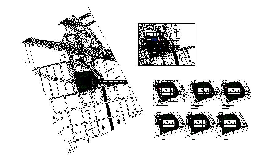 Transfer sports center building floor plan and distribution plan details that includes a detailed view of car parking floor, tree view, wall design with basement car parking floor details, children play area, common lobby, theater, passage, display area, shopping plaza department, green space, gallary, theme restaurant, viewing gallery, kitchen, waiting area, open space, sanitary facilitates, play area, ground pitch, garden area and much more of sports center details.