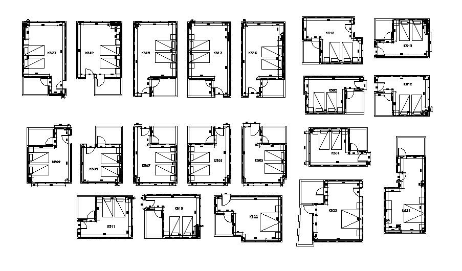 Multiple hotel rooms distribution plan cad drawing details that includes a detailed view of furniture layout details, bed view, doors and window details, interior details, dimensions details and much more of hotel bedroom details.