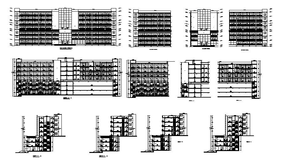 Luxuries multi-level five star hotel all sided elevation and sectional details dwg file