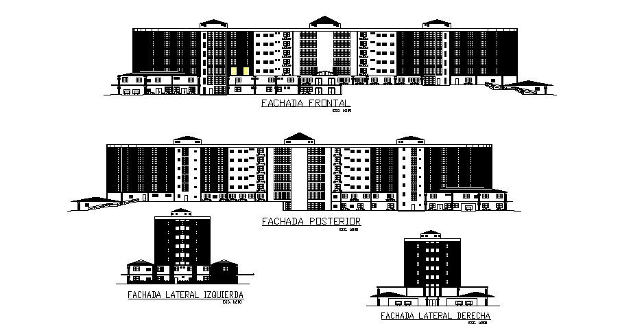 Multi-story civil hospital all sided elevation cad drawing details dwg file