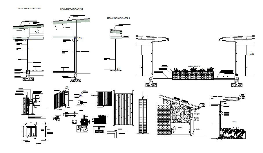 Cut section and constructive structure details of house that includes a detailed view of flooring view, wall construction, memory of materials, footings details, column view, beam construction, covers closure type, soil burried wall closure , exterior solera, holes, interior partition, granite veneer of the country with steel supports, halfeneisen type, Brick partition, plaster plastering, Concrete wall and much more of house structure details.