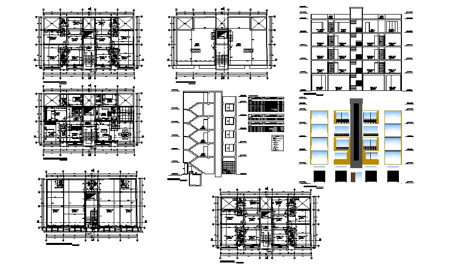 Multi-story corporate building elevation, section and floor plan details dwg file