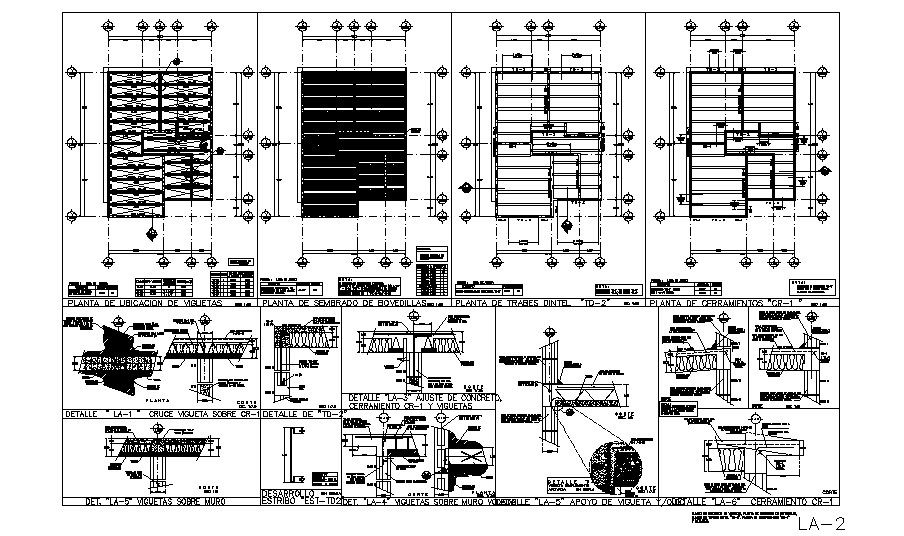 Foundation plan, cover plan and wall construction details of building that includes a detailed view of the foundation, side typical shoe, typical central shoe, columns, foundations, shoes, cistern tank, walls of concr. arm., beams flat, peralted beams, foundation beams, (cement: sand: crushed stone), typical detail of reinforcement and ended of walls of masonry, detail of cistern, cure the concrete by wet way minimum 7 days, - avoid splices and overlaps in areas of maximum effort and much more of construction details.