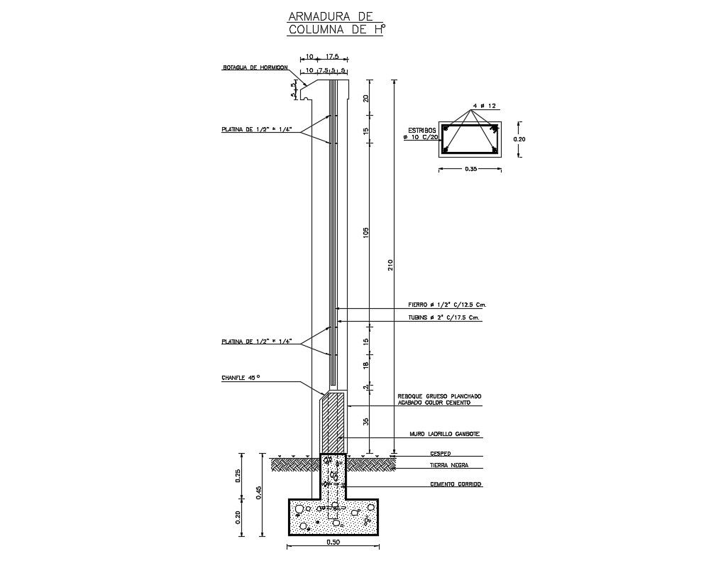 Armor concrete column construction cad structure details that includes a detailed view of capacity of load of the ground at level of foundation of shoes, foundation floors, concrete-cement mixture, false floors, cement-concrete mixture (on compacted soil), Surpluses, cement-concrete mix medium stone, concrete structural, elements of confinement of masonry walls of hollow blocks, Minimum lengths of overlap (unless indicated) and much more of column details.