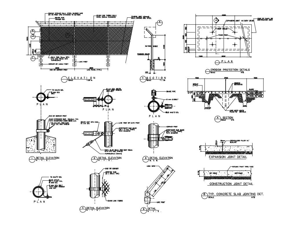 Fence section, plan and constructive structure details that includes a detailed view of welded fence section details, aluminium steel bolted, gauge corrugated alluminium sheets bolted to purlins, castelated i-section welded at both end to other supporting members, welded apex gusset plate and much more of structure details.