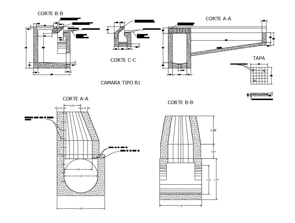 Cut sinks and cameras cad structure details that includes a detailed view of Viga rectangular double estribado diameter 8mm diameter. 6mm C / 10 cm, long armor camara diam. 8 mm diam. 6mm w / 10cm, profile modified pavement formation and much more of structure details.
