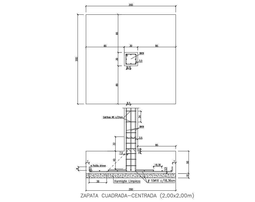 Squared center shoe and wall construction cad drawing details dwg file