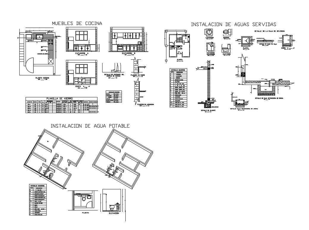 Kitchen section, plan and construction details of house that includes a detailed view of all sided section details of kitchen with wall design, tile design, dimensions details, furniture details, interior details, cooking area, platform area, gas stove, sink and plumbing details, electrical equipment details, chimney and exhaustion, ceiling details and much more of kitchen details.