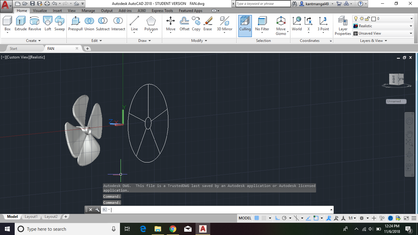 WE SEND A 3D FAN AND WE MADE THIS BY THE USE OF AUTO CAD 3D COMAND AND USED OF EXYRUDE TRIM HELIX INTERCEPT ETC.