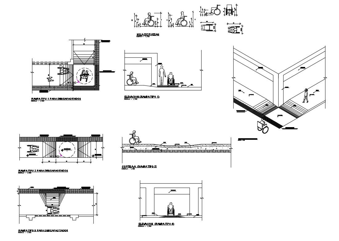 Access gate and ramp structure for handicapped people cad drawing details that includes a detailed view of ramp type 1 for the disabled, Elevation (ramp type 1), Type 2 ramp for the disabled, Type 3 ramp for the disabled, Gutter with stage, Compacted earth, Affirmed, people blocks, wheel chair block and much more of gate and ramp details.