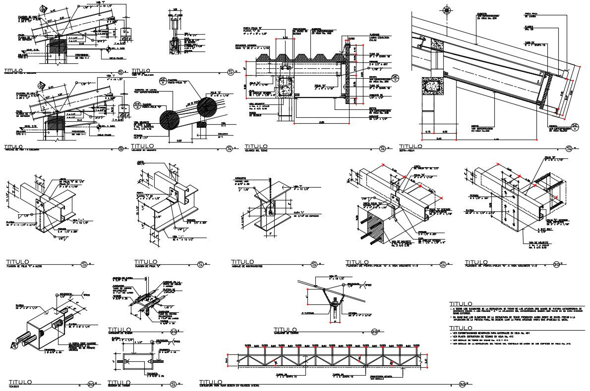 Roof construction and structural details that includes a detailed view of previously linked support, multilayer insulation panel, rubber shock absorber element, galvanized profile for anchorage, acoustic sandwich. (see detail), dimensions details, memory of materials, concrete details, cuts and joints details, reinforcement details, water proofing details and much more of roof structure details
