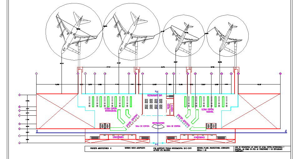 International airport layout plan cad drawing details that includes a detailed view of multiple entry doors of different terminal, car parking area, indoor and outdoor garden area, main entry gate of airport with security check, waiting area, seating lounge, boarding gates, ticket counters, shopping areas with shopping branded stores, food stores, cafeteria, toilets for male and female, luggage room, car parking area, main waiting area hall, runway details, airplane view, interior details, furniture details, runways, transportation truck and much more of airport plan details.