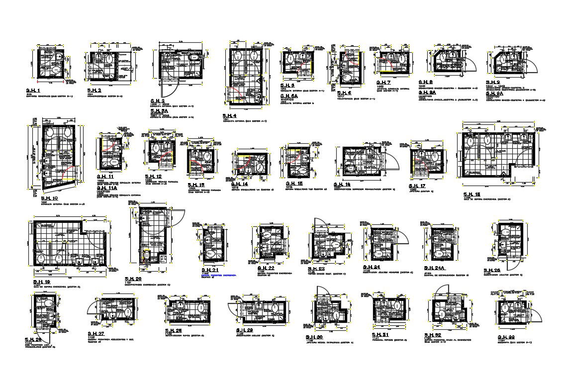 Bathroom developments section, plan and installation details that includes a detailed view of toilet plan, floaded elevation of toilet, toilet sections and elevations, doors and ventilations, plumbing details, evc with flush tank, ewc with flush tank, urinals with sensor, wash basin, fd- floor drain, bib cock, health faucet, angle stop cock, piller cock, paper holder, soap dispenser toshi, granite counter, mirror frame, towel rail/ring and much more of sanitary installation details.