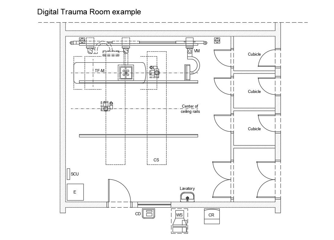 Trauma room plan details of hospital cad drawing details that includes a detailed view of medical equipment details, furniture layout plan details, cabin details, area details, dimensions details, doors and windows details and much more of room details.