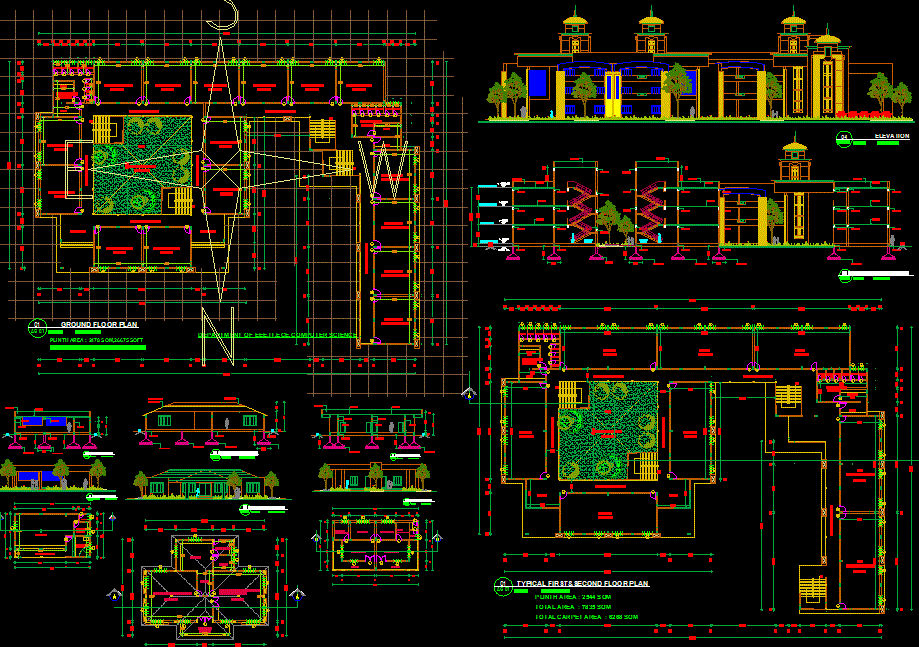 Engineering College DWG file with ground and upper floor layouts, elevation drawings, faculty rooms, and sectional details ideal for architectural planning.