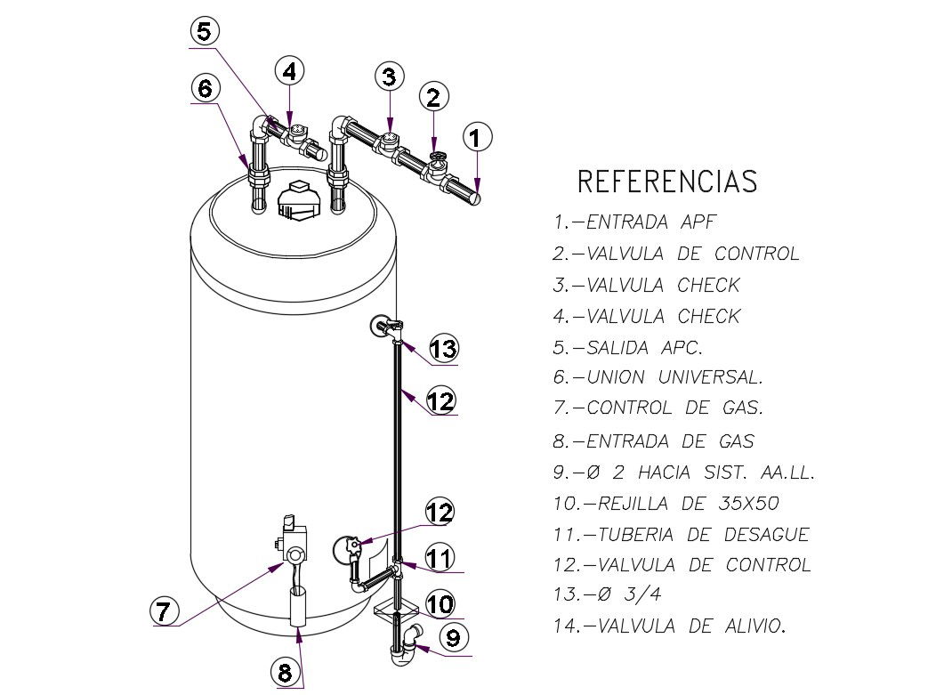 Gas tank section and installation details that includes a detailed view of check valve details, control valve, pvc pipes details, dimensions details, machinery details and much more of gas tank details.