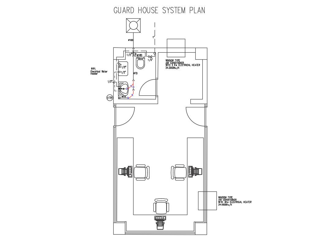 Guard house system plan with sanitary installation details that includes a detailed view of main entry gate, office desks, computers, furniture details, dimensions details, sanitary equipment installation details, doors and ventilation details, plumbing details, interior details and much more of house details.