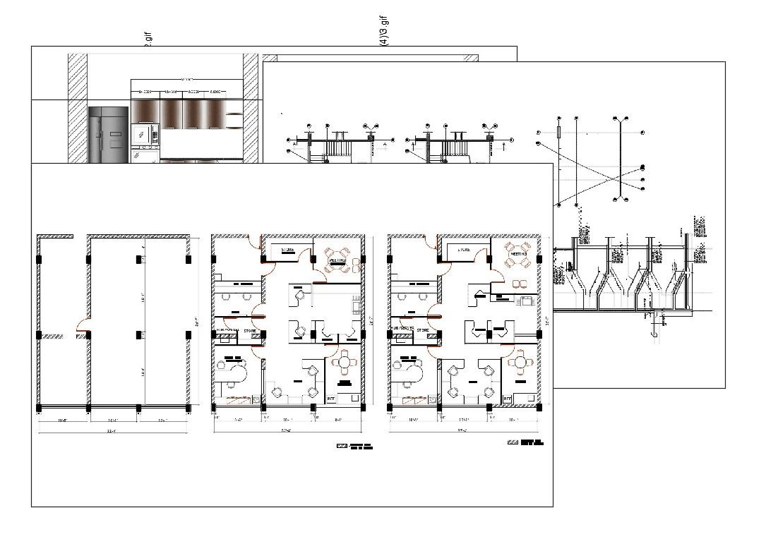 Office floor plan, cover plan, staircase construction and kitchen details dwg file