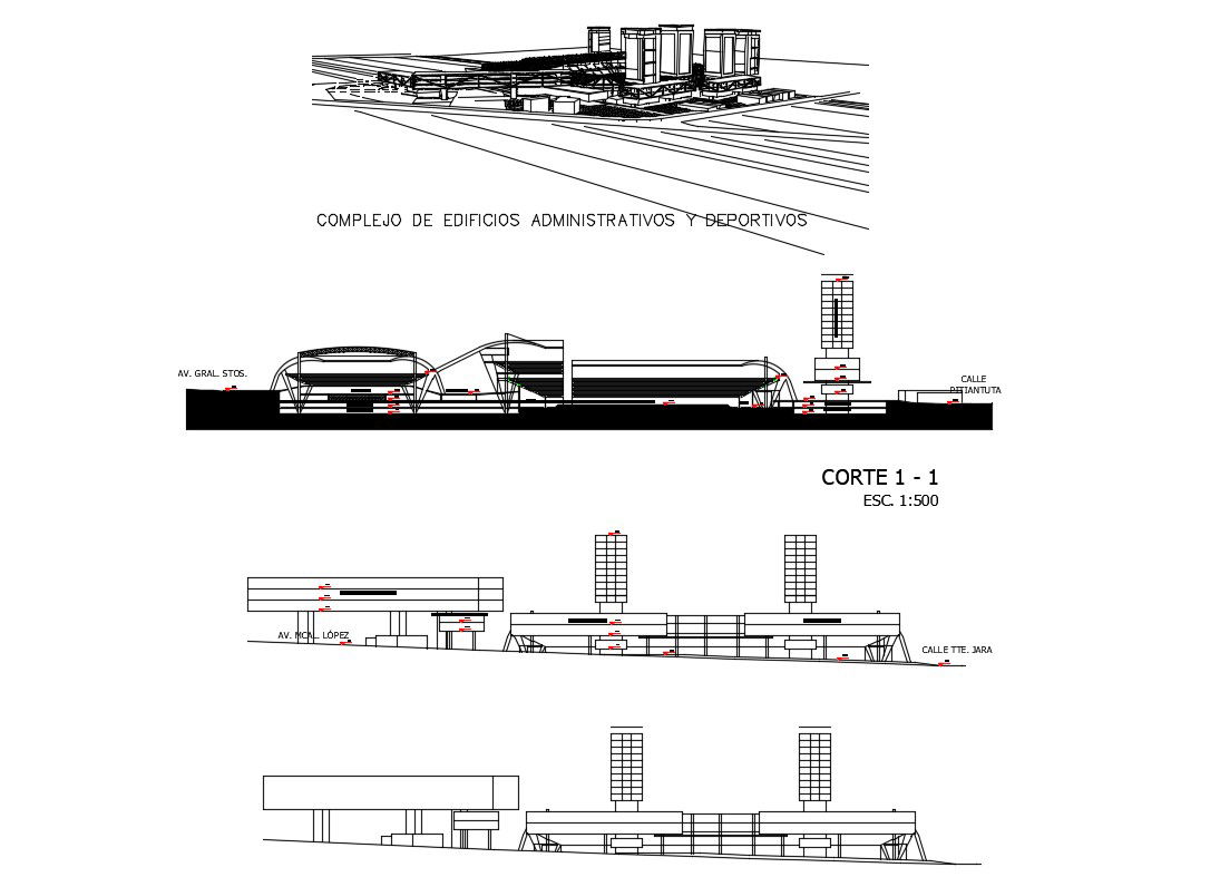 Complex of administrative and sports buildings elevation and section details that includes a detailed view of facade back and side elevations and section details with flooring view, doors and windows view, staircase sectional details, balcony view, wall sections and dimensions details, car parking floor, tree view, wall design and much more of corporate building project.