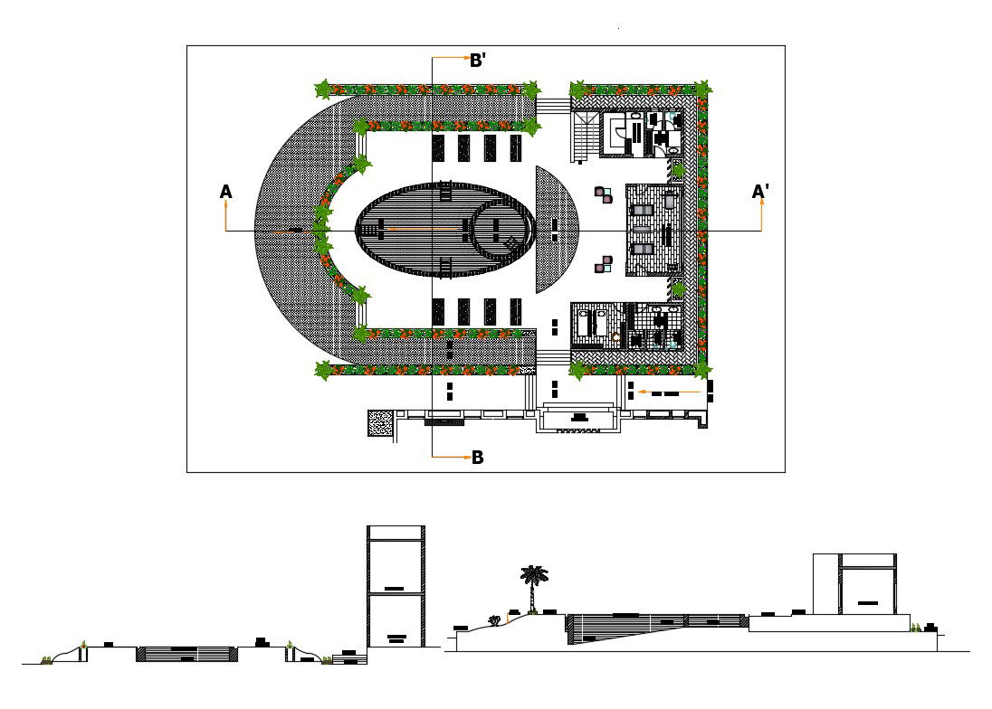 Salon building main section and distribution plan details dwg file
