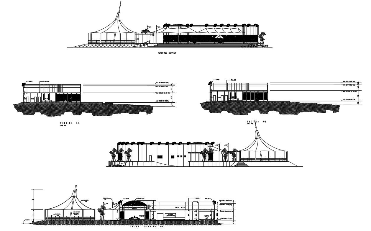 Canteen block elevation and section details of automobile research center that includes a detailed view of facade back and side elevations and section details with flooring view, doors and windows view, staircase sectional details, balcony view, wall sections and dimensions details, car parking floor, tree view, wall design and much more of canteen details.