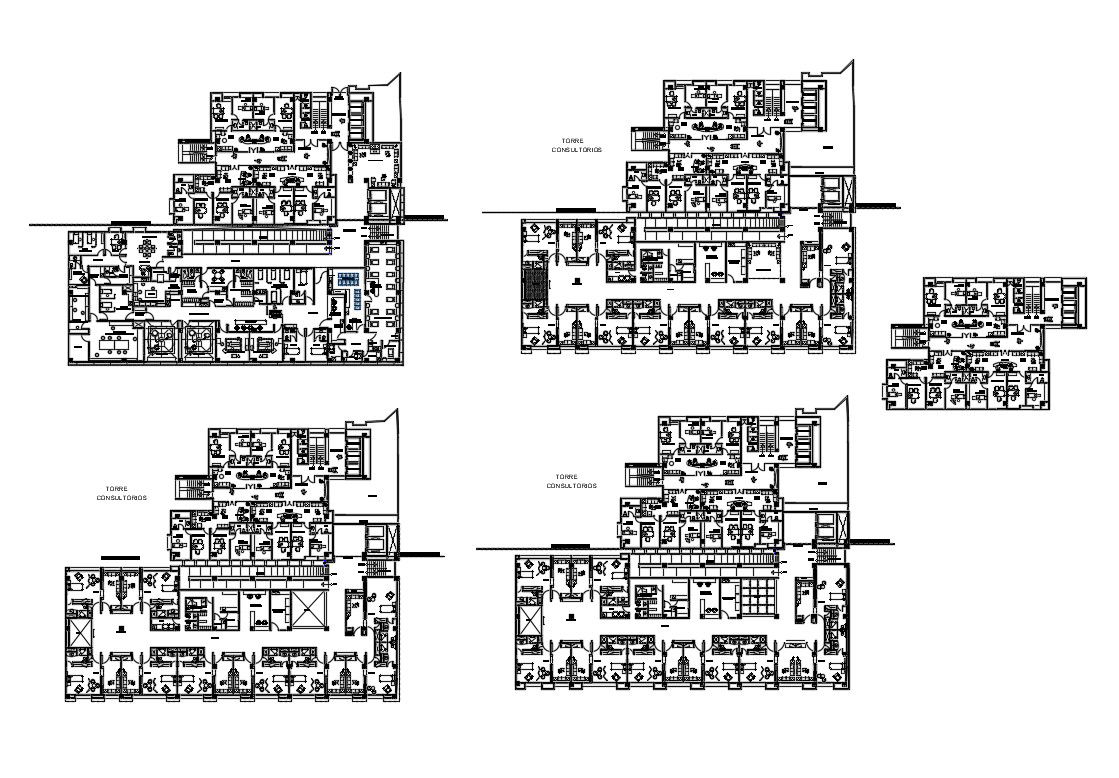All floors layout plan details of multi-level maternity hospital that includes a detailed view of reception area, waiting area, consultant room, specialized departments, operation theater, cleaning departments, pharmacy stores, special and general ward, specimen collection, emergency laboratory, imagenology, laboratories, circumbulatory, waiting rooms, sanitary man, duct, central nursing, sanitary, x-ray, tomography, mastography and desitography, rest area and sanitary, development and printing , interpretation, emergency laboratory, special tests, washing and stirilization, classification and distribution of samples, washing and sterilization, culture media and much more of hospital plan.