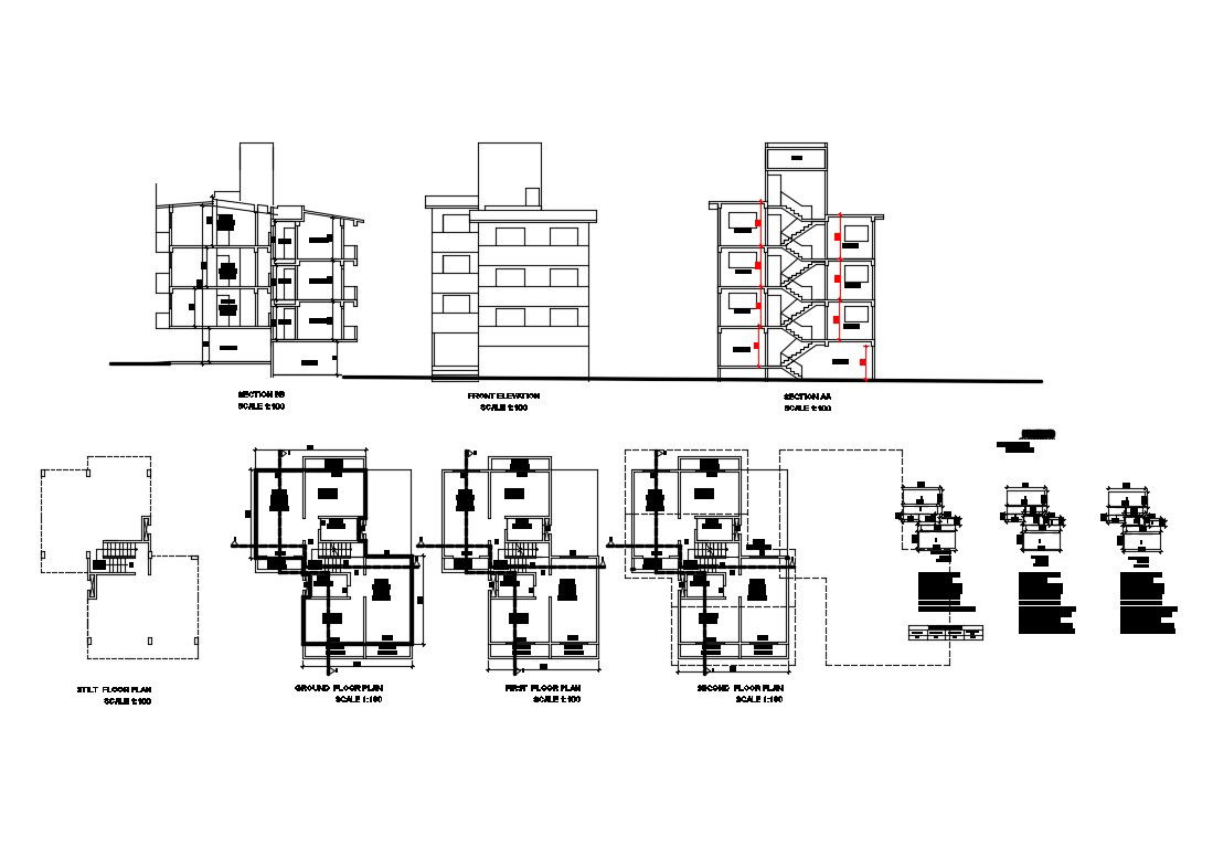 Multi-flooring municipal row house detailed architecture project dwg file