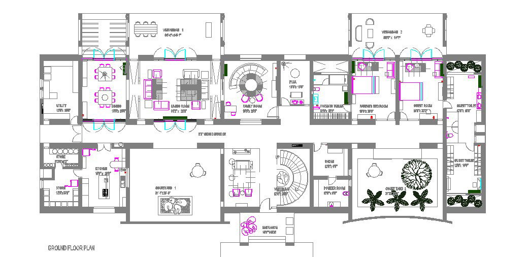 One family house ground floor plan cad drawing details that includes a detailed view of main entry house door, drawing room, living room, family hall, kitchen, dining area, indoor staircases, laundry area, balcony, bedroom, master bedroom, toilets and bathroom, indoor doors, furniture details and much more of house floor plan.