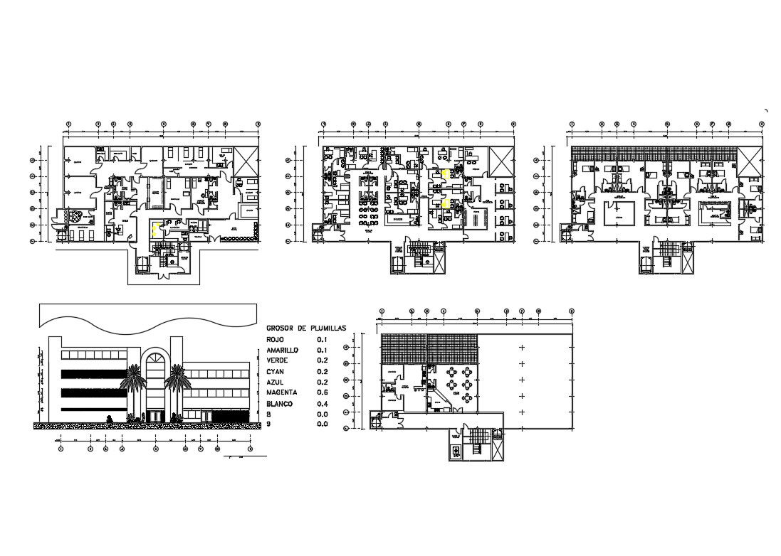 Multi-level hospital main elevation and floor plan details that includes a detailed view of flooring view, doors and windows view, staircase view, balcony view, wall design, dimensions, roof or terrace view, reception area, waiting area, consultant room, specialized departments, operation theater, cleaning departments, pharmacy stores, special and general ward, specimen collection, emergency laboratory, imagenology, laboratories, circumbulatory, waiting rooms, sanitary man, duct, central nursing, sanitary, x-ray, tomography, mastography and desitography, rest area and sanitary, development and printing , interpretation, emergency laboratory, special tests, washing and stirilization, classification and distribution of samples, washing and sterilization, culture media and much more of hospital plan.