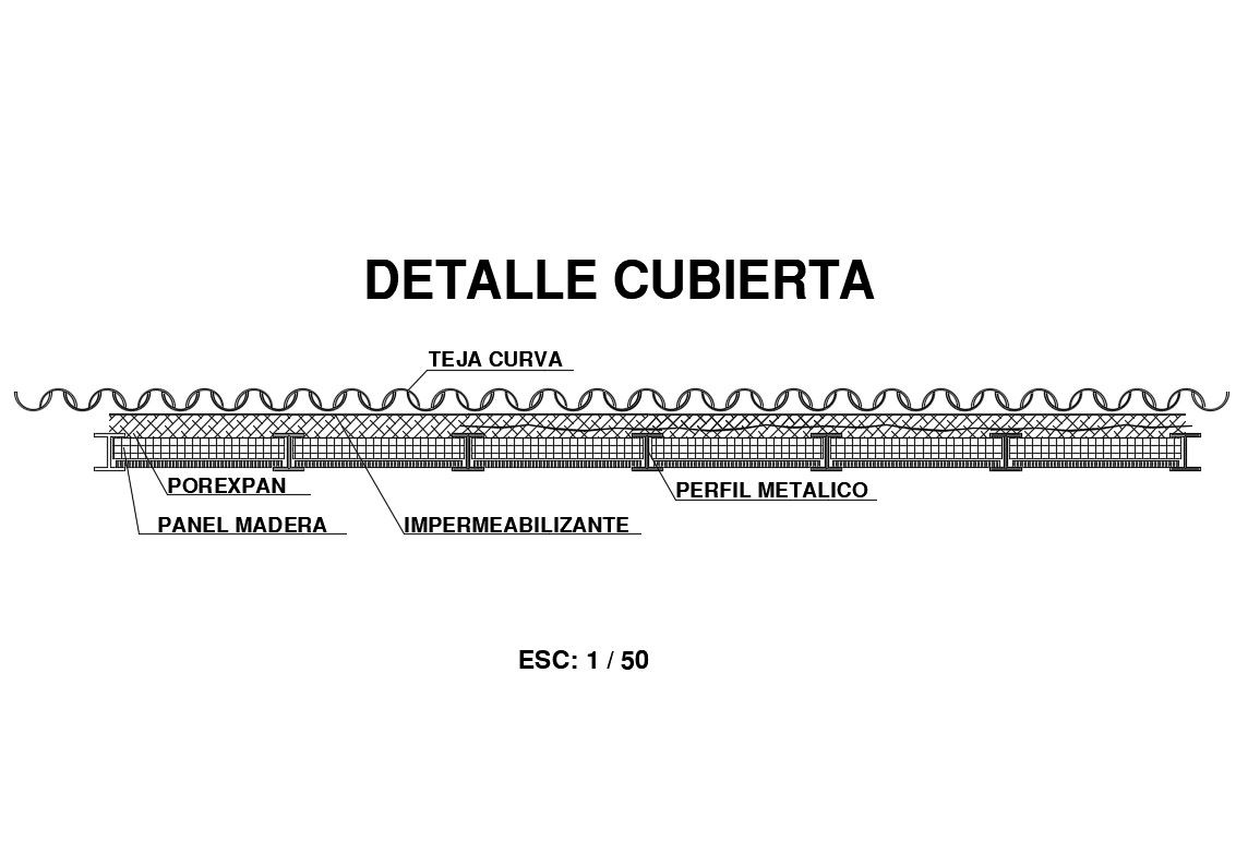 Roof structure of house cad drawing details that includes a detailed view of previously linked support, multilayer insulation panel, rubber shock absorber element, galvanized profile for anchorage, acoustic sandwich. (see detail), dimensions details, memory of materials, concrete details, cuts and joints details, reinforcement details, water proofing details and much more of roof structure details.