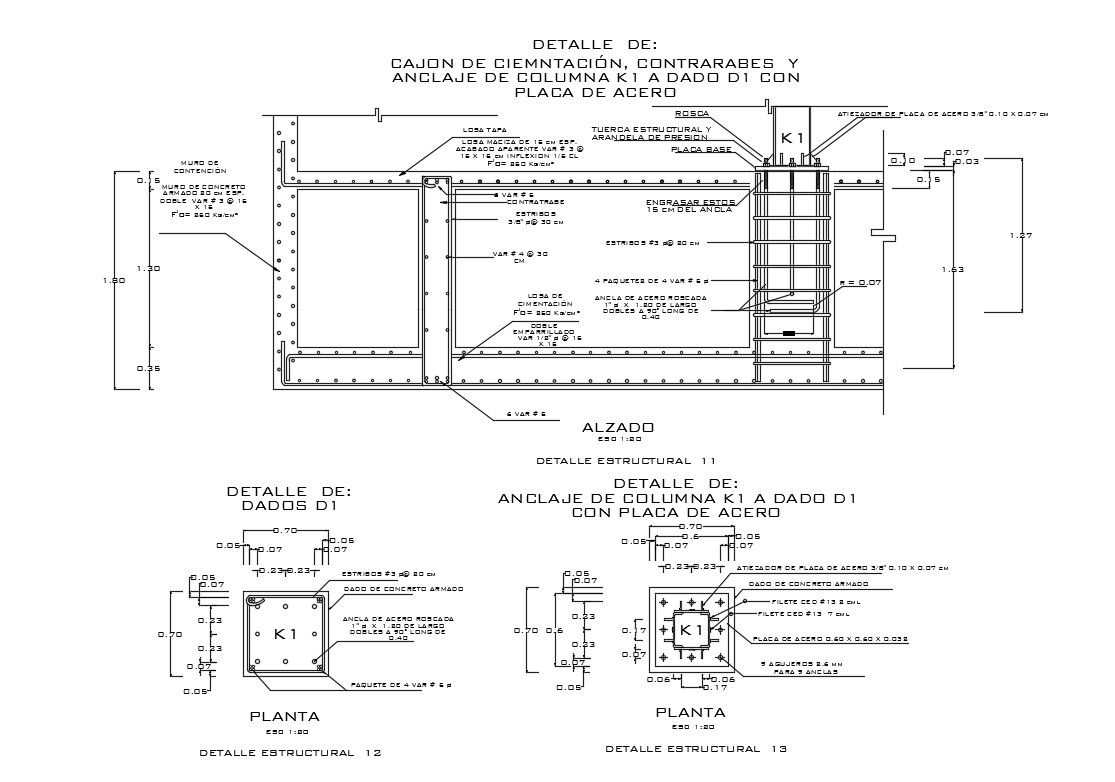 Slab of foundation construction with column cad drawing details that includes a detailed view of the foundation, side typical shoe, typical central shoe, columns, foundations, shoes, cistern tank, walls of concr. arm., beams flat, peralted beams, foundation beams, (cement: sand: crushed stone), typical detail of reinforcement and ended of walls of masonry, detail of cistern, cure the concrete by wet way minimum 7 days, - avoid splices and overlaps in areas of maximum effort and much more of structure details.