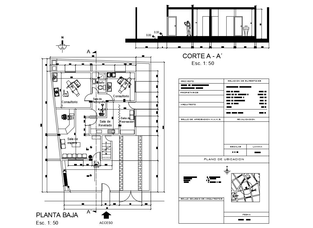 Main section and ground floor plan details of clinic that includes a detailed view of doors and windows view, staircase view, balcony view, wall design, dimensions, roof or terrace view, that includes a detailed view of flooring view, doors and windows view, staircase view, balcony view, wall design, dimensions, roof or terrace view, and much more of hospital details.