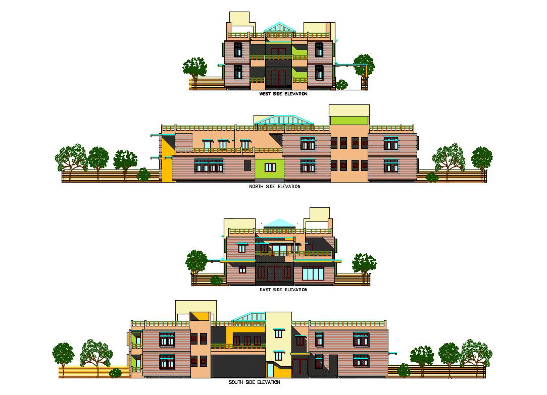 One family bungalow all sided elevation cad drawing details that includes a detailed view of flooring view, doors and windows view, staircase view, balcony view, wall design, dimensions, roof or terrace view, colors details, tree view and much more of bungalow details.
