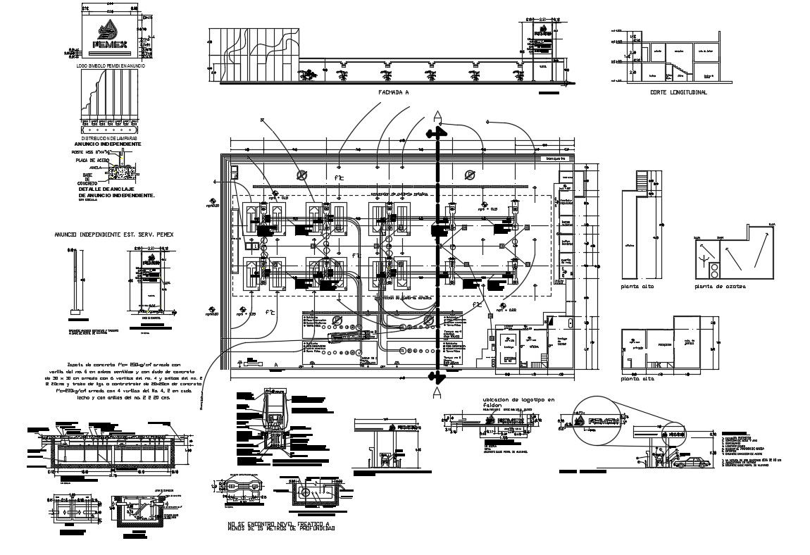 Gas station plant installation and structure details that includes a detailed view of inst. tap, nickel-plated bronze swan neck wrench, gas socket with bronze piton, Contrazocalo tile, stainless steel laundry, white mayolica, mayolica cut, porcelain filling, rubber protector, stainless steel laundry, for hose connection, simple union, machinery details, processing plant details, administration office details and much more of gas station details.