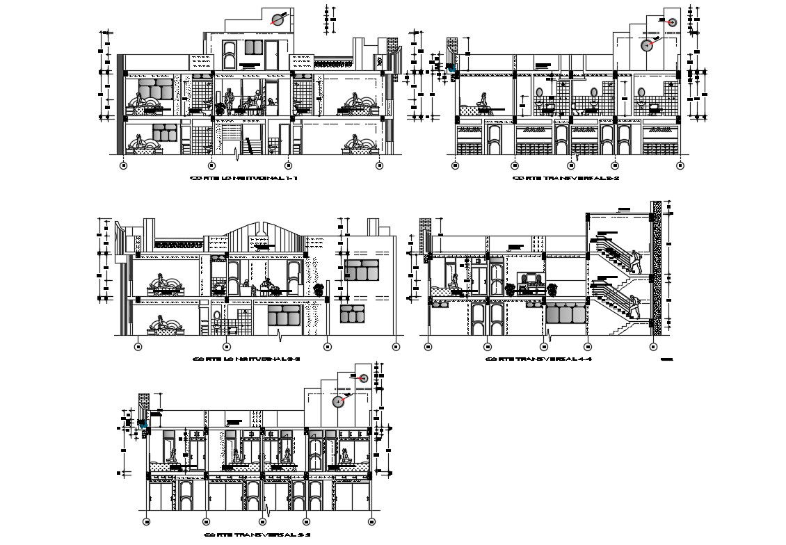 Multi-familiar residential building all sided elevation and section details that includes a detailed view of facade back and side elevations and section details with flooring view, doors and windows view, staircase sectional details, balcony view, wall sections and dimensions details, car parking floor, tree view, wall design and much more of building details.