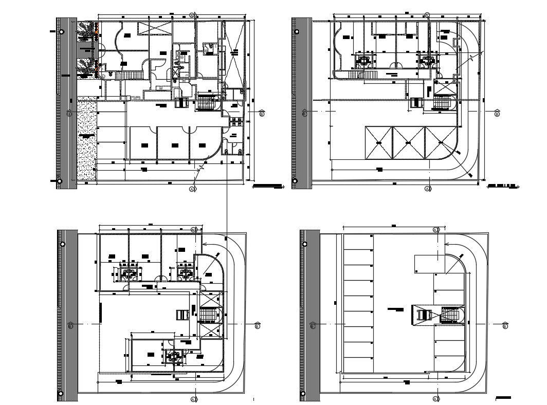 Ground, first, second and terrace floor plan details of mini shopping mall dwg file