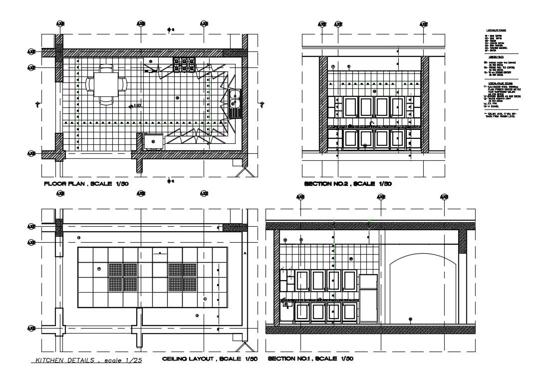 Ceiling layout, floor plan scale, furniture and interior details of kitchen dwg file