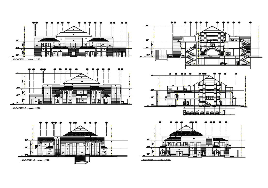 All sided elevation and section details of corporate office building that includes a detailed view of facade back and side elevations and section details with flooring view, doors and windows view, staircase sectional details, balcony view, wall sections and dimensions details, car parking floor, tree view, wall design and much more of office project.
