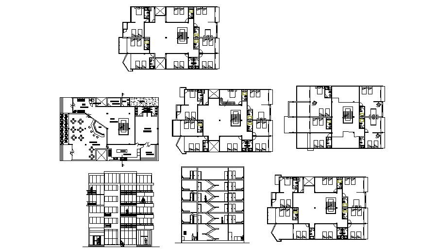 Multi-level hotel building elevation, section and floor plan cad drawing details dwg file
