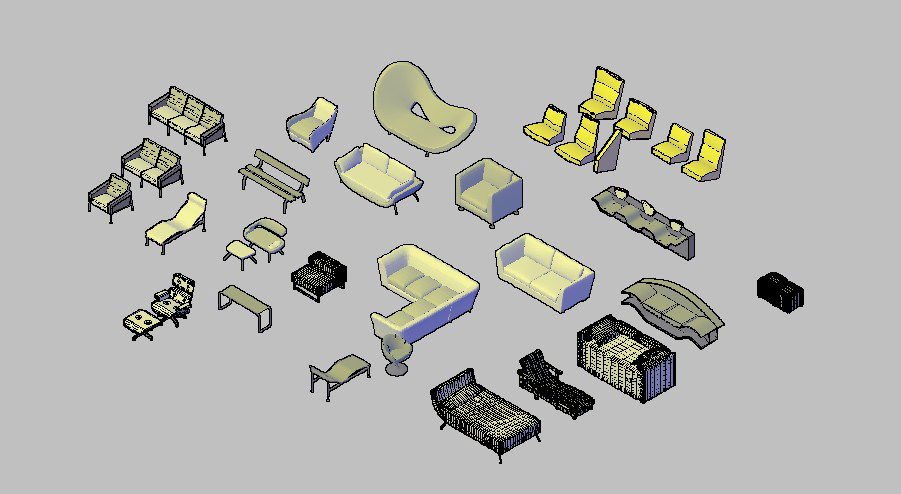 Creative common 3d furniture blocks cad drawing details that includes a detailed view of multiple furniture blocks like chairs, sofa sets, tables etc with colors details, size details, type details etc for multi purpose uses for cad projects.