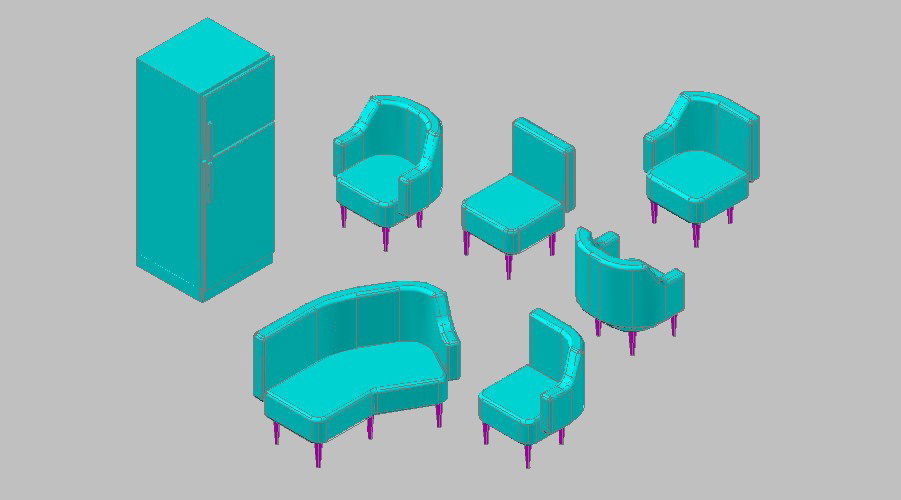 Miscellaneous household furniture blocks 3d drawing details that includes a detailed view of multiple furniture like refrigerator, chair, sofa set etc with colors details, size details, type details etc for multi purpose uses for cad projects.