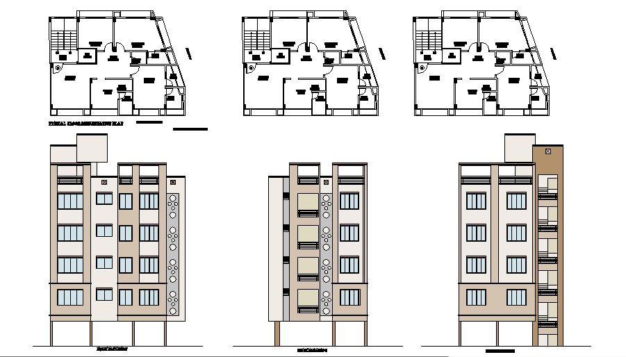 Residential apartment building elevation and floor plan details that includes a detailed view of flooring view, doors and windows view, staircase sectional details, balcony view, wall sections and dimensions details with main entry gate, mini garden, car parking view, main entry house door, drawing room, living room, family hall, kitchen, dining area, indoor staircases, laundry area, balcony, bedroom, master bedroom, toilets and bathroom, indoor doors, furniture details and much more of apartment project.