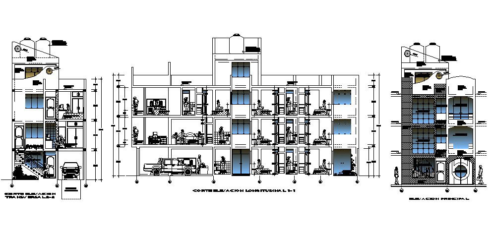 Residential apartment building facade and side section details that includes a detailed view of front and back sectional view, side sectional view, flooring view, doors and windows view, staircase view, balcony view, wall design, dimensions, roof or terrace view, car parking view and much more of sectional details.