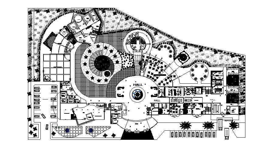 Four star luxuries hotel distribution plan cad drawing details that includes a detailed view of parking area, outdoor garden, reception area, waiting lounge, dining area, banquet hall, kitchen, cleaning department, staff room, sanitary facilities, furniture details, interior details, laundry department, spa, gym, back yard garden, service area, bedrooms like honeymoon suits, double bedrooms etc, cleaning departments, cafeteria, bar, terrace, elevators and much more of hotel project.