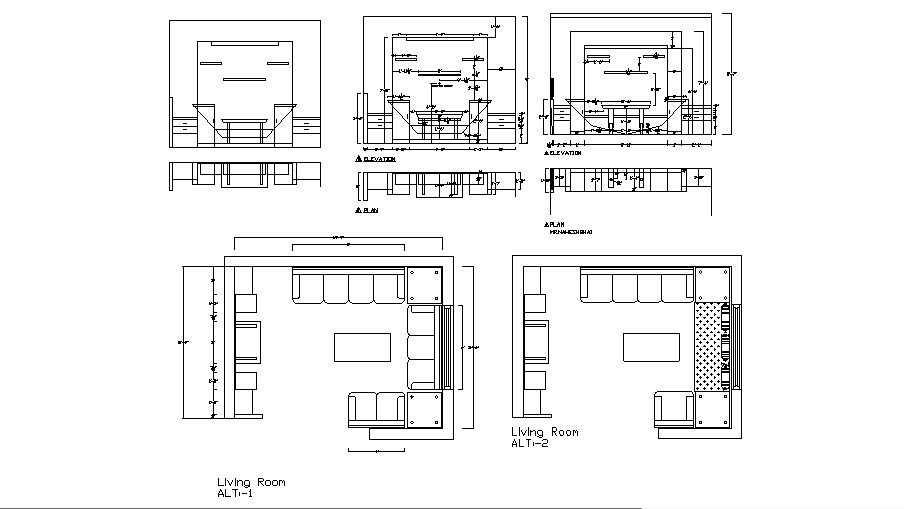 Living room elevation and plan cad drawing details that includes a detailed view of all sided elevation details, dimensions details, sofa set details, furniture layout details, interior details and much more of living room details.