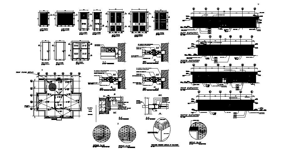 Doors and windows elevation and installation details of office building that includes a detailed view of door elevation, window elevation, welded plate for grappling the clamp, door elevation details, door section details, double swing handle (with placement accessories), reinforcement rib, expanded metal, ceramic block, ceramic, block, lintel 2 irons, wood cap, frame and much more of door and window installation details