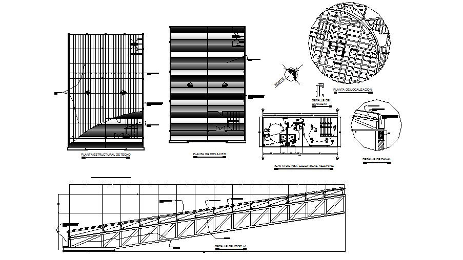 Roof construction, electrical layout plan and structure details of industrial nave dwg file