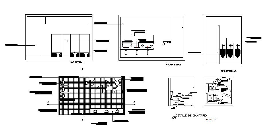 Public health sanitary facilities section, plan and installation details that includes a detailed view of toilet sectional details, passage, sanitary equipment installation details, doors and ventilation details, plumbing details, interior details, dimensions details, wall section details and much more of sanitary installation details.