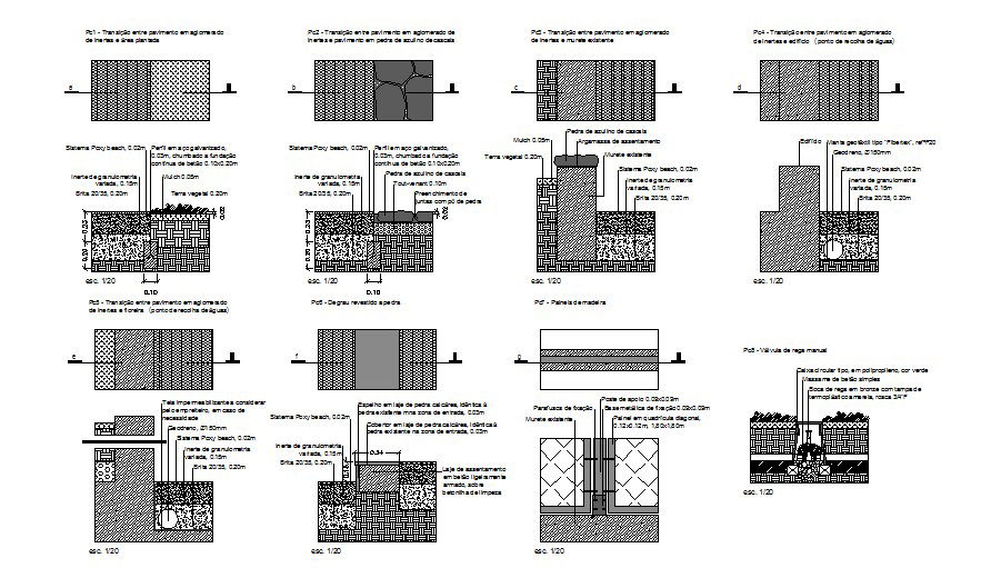 Pavement and landscaping automation cad drawing details that includes a detailed view of pavements, sidewalks and terraces in front of the vilcanota, pavements plaza mirador del vilcanota, plazuela auction of the malecon, hot water malecon, staircase and ramp of the cultural plaza, link platform to the malecon, central bank of the cultural plaza, Detail of the floor of the sale point, module with ramp and stairs, cut-lifting of the planter bench, cut-lifting of the planter bench, typical boardwalk of the seawall and much more of garden details.