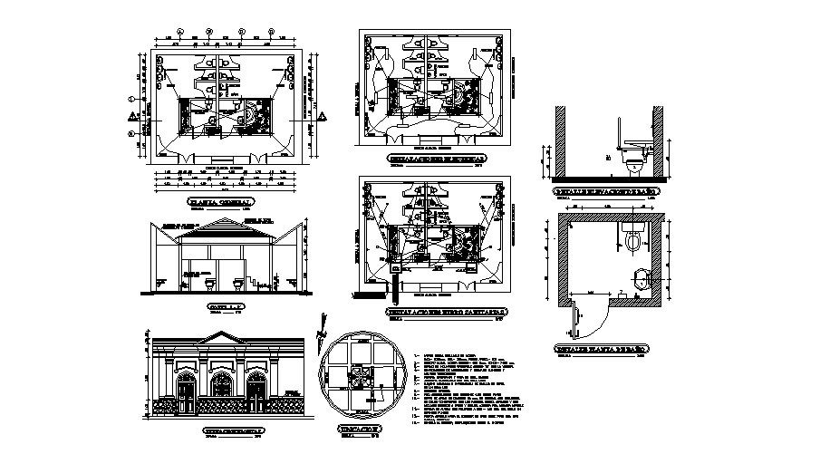 Sanitary services elevation, section, plan and installation details that includes a detailed view of toilet sectional details, passage, sanitary equipment installation details, doors and ventilation details, plumbing details, interior details, dimensions details, wall section details and much more of sanitary installation details.